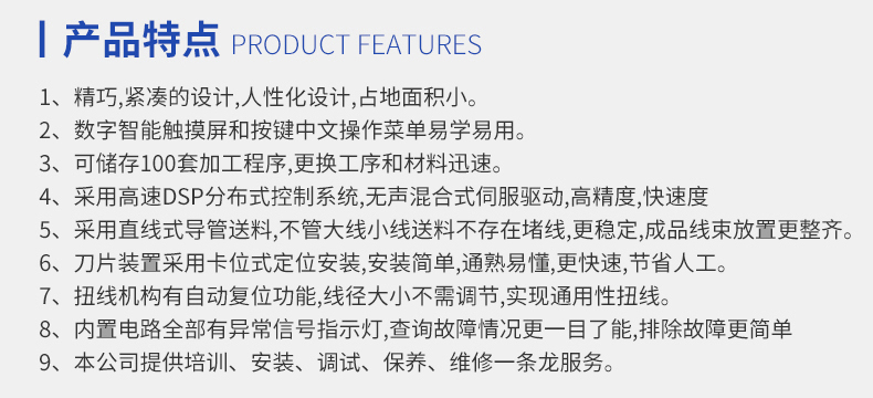 LL-556全數(shù)字智能五線單頭打端沾錫機 產(chǎn)品說明: 1.精巧,緊湊的設計,極佳人性化設計,占地面積小。 2.數(shù)字智能觸摸屏和按鍵中文操作菜單易學易用。 3.可儲存100套加工程序,更換工序和材料迅速。 ...